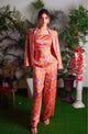 An elegant three-piece co-ord set in satin. Available in two colours green and orange. Consists of A-line pants, a spaghetti bustier with a jacket. The jacket comes with fabric buttons and fits perfectly to the body. As the name suggests, it will definitely make you feel like a boss!